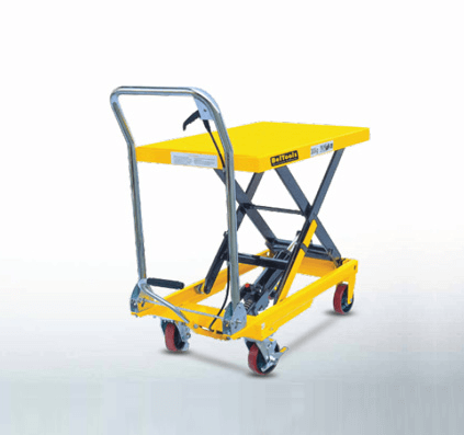 O equipamento é operado por pedal hidráulico e pode ser adaptado com tampo giratório, entrada para paleteira ou base basculante, de acordo com a aplicação.